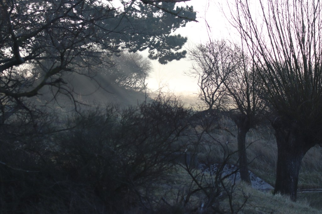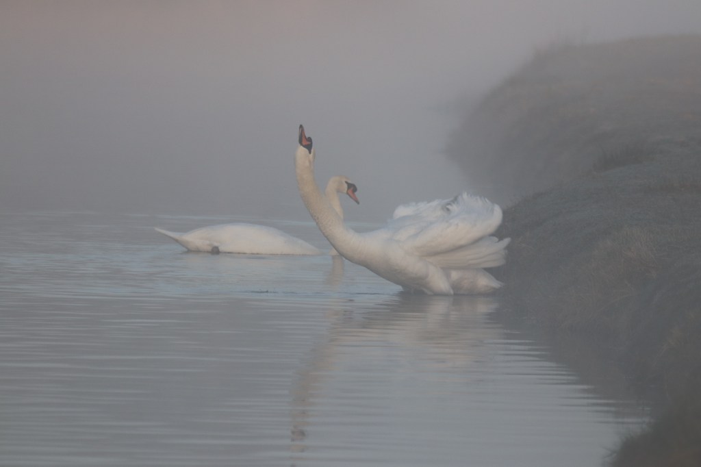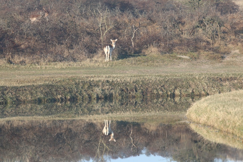 Mijn broer zei: “Als je damherten wilt zien dan moet je naar de Amsterdamse waterleidingduinen”, toen ik vertelde dat ik herten wilde fotograferen. Laat dat nou net ook de plek zijn waar ik voor mijn studie een klein onderzoek moest doen naar verbranding als beheermaatregel van het duingebied. Om de mooiste foto’s te maken zorgden we ervoor dat we op een zaterdagochtend met zonsopkomst bij de Amsterdamse waterleidingduinen waren. Als traktatie hing er ook nog een mooie mist over het gebied. Als eerste kwamen we een paartje zwanen tegen die zich aan het wassen waren. Tegen het licht in kreeg je de mooiste mistfoto’s (zie foto 6, 7, 20 en 26).