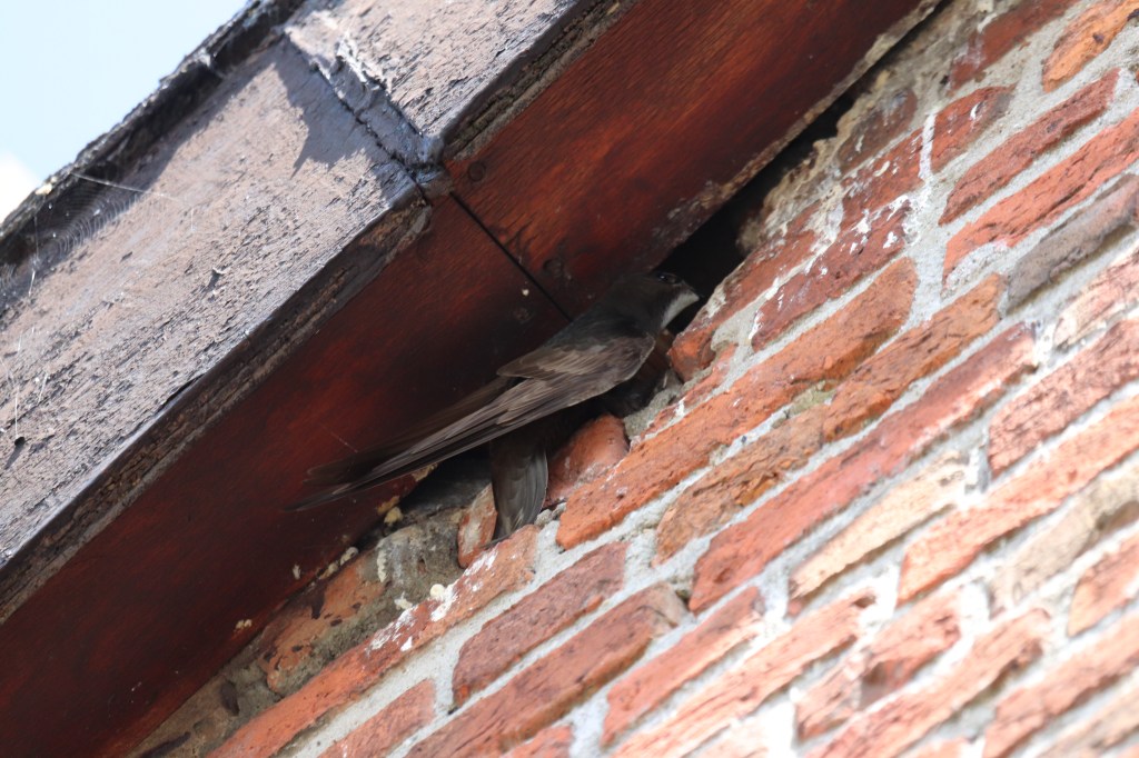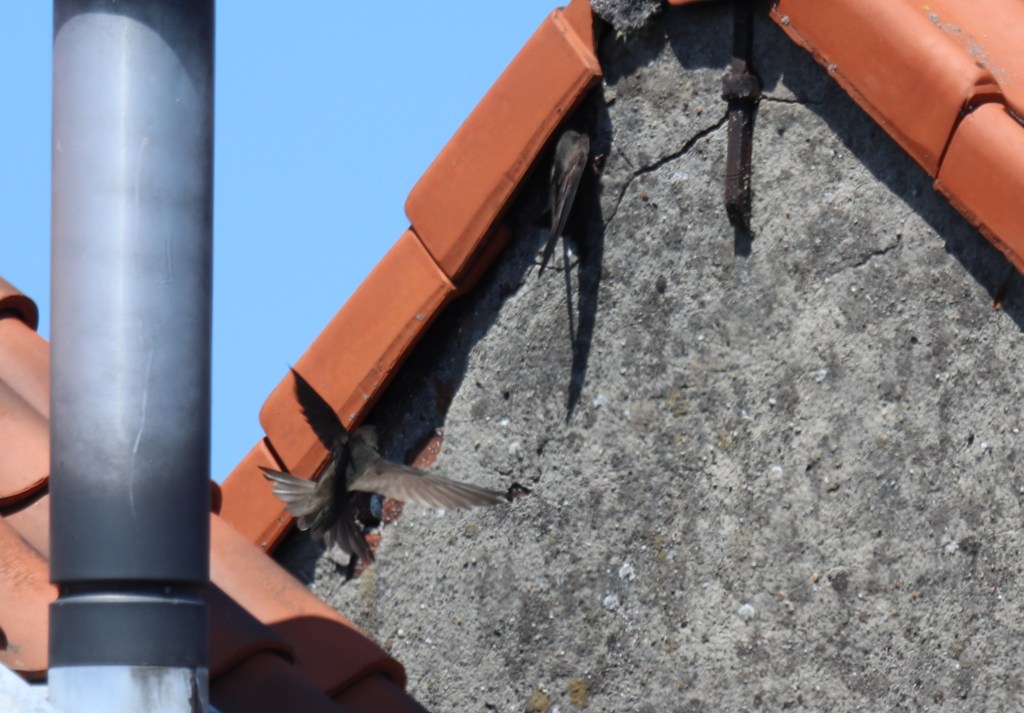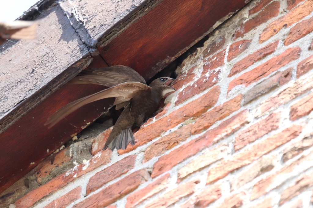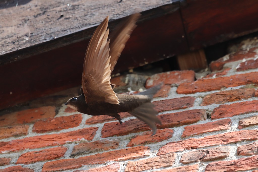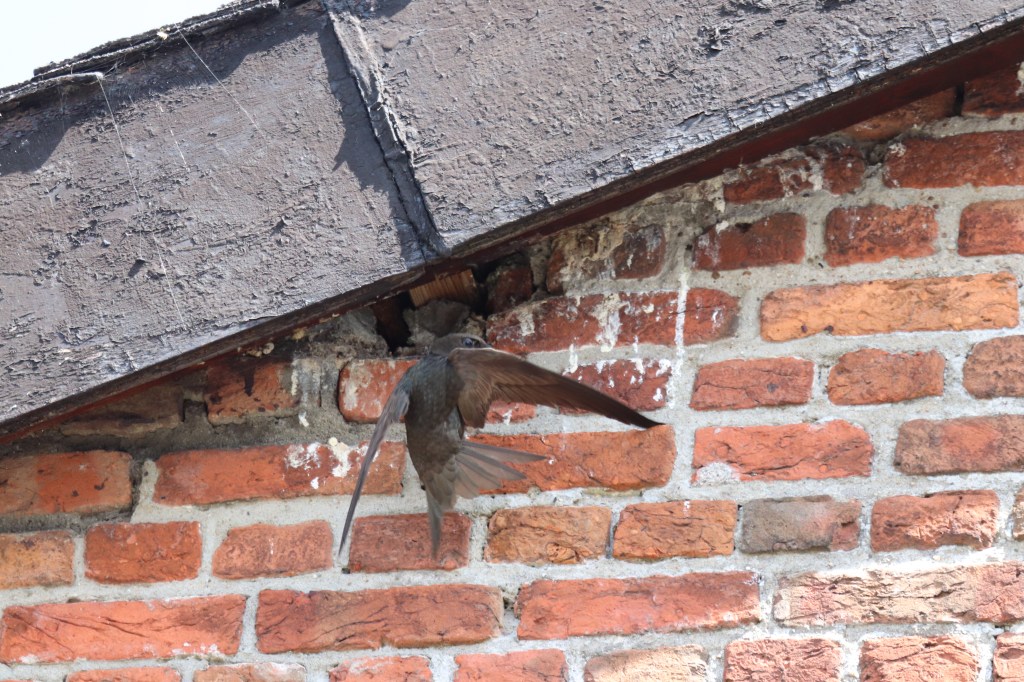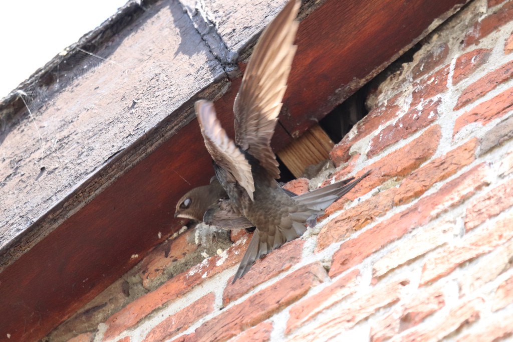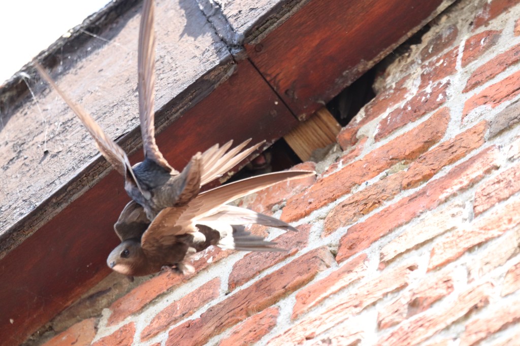 Gierzwaluwen behoren tot de snelste vogels van de wereld. Als ze hun nest invliegen kan dit wel met een snelheid gaan van 111 km per uur. En dit moet ook nog precies goed gemikt zijn op het nest, wat meestal slechts een klein gat of spleet is (zie foto 1 t/m 4 en overige). De reden hiervoor is dat ze korte poten hebben. Doordat ze zulke kleine poten hebben kunnen ze niet over de muren kruipen of lopen. Ze kunnen wel schuifelend hun nest in komen maar hierbij moet de afstand niet te ver zijn van het nest. Hierom zie je ze ook wel het nest aantikken als het nog net te ver is. Dan is de aanloop niet goed gegaan en vliegen ze weer verder. EÊn keer heb ik een gierzwaluw tegen de muur aan zien vliegen. Dit was geen fraai gezicht. Maar hij vloog gewoon weer verder. Ik heb het idee dat ze hierom ook wel tegen een stootje kunnen (gelukkig).